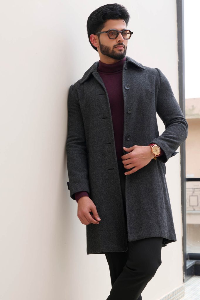 Fashion-forward: Layered outfits — like a tailored charcoal overcoat over a deep burgundy turtleneck — show editorial awareness. This is what fashion publications and premium clothing labels specifically look for.