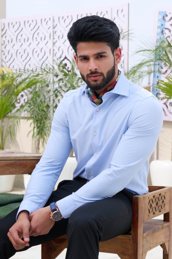 Smart-casual/business: A fitted light blue formal shirt with dark trousers and loafers signals that you can front corporate campaigns, fintech brands, or premium menswear shoots without effort.